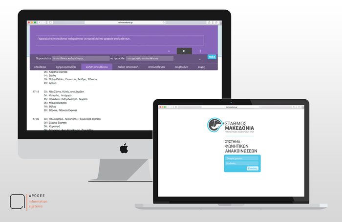 Παραδόθηκε στο ΚΤΕΛ Μακεδονία το λογισμικό εκφώνησης ανακοινώσεων που σχεδιάστηκε και αναπτύχθηκε από την Apogee Information Systems με στόχο την βελτιστοποίηση της ενημέρωσης των επιβατών και την αυτοματοποίηση των εκφωνήσεων των προγραμματισμένων δρομολογίων και των άλλων ανακοινώσεων του Σταθμού.