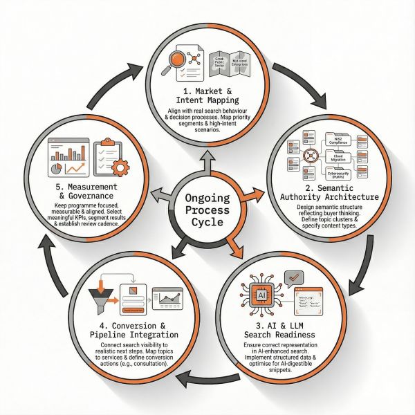 In Greece, many IT projects do not end with an online purchase but with a consultation, a διαγωνισμό, or a first exploratory meeting. Our SEO process is therefore tightly aligned with sales and business development workflows. We: