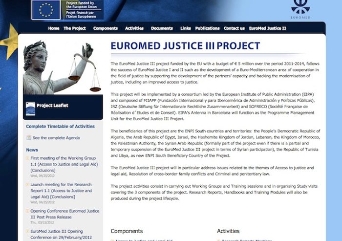 The EuroMed Justice III project funded by the EU with a budget of € 5 million over the period 2011-2014, follows the success of EuroMed Justice I and II such as the development of a Euro-Mediterranean area of cooperation in the field of justice by supporting the development of the partners’ capacity and backing the modernisation of justice, including an improved access to justice.