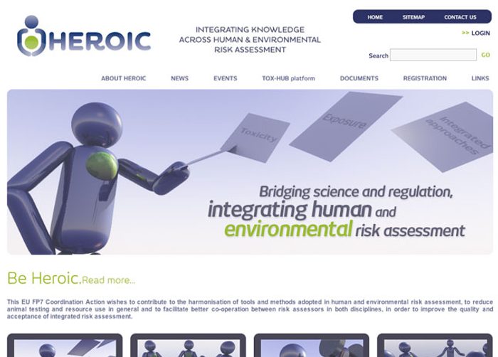 HEROIC is a pan-European (9 partners, 7 countries) effort to integrate knowledge across human and environmental risk assessment. Heroic project aims to bring science and regulation together, reduce animal testing and resource use in general, facilitate better co-operation between risk assessors in both discipline, in order for the quality and acceptance of the integrated risk assessment to be improved. In the Heroic website the users can find events, documents with brochures, publications, white papers, information about the project, useful links and registration details. The users can be able to log in the private area and use the platform that is built for sharing the existing knowledge in a conceptual framework of data, methods, processes and training.